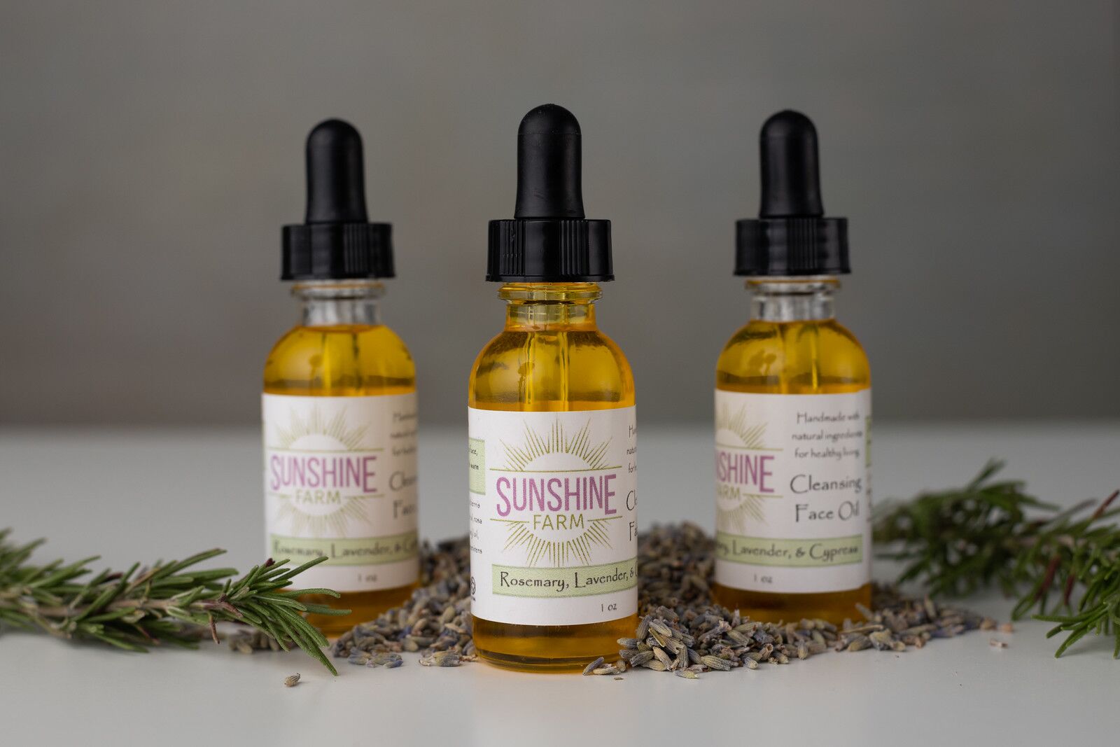 Step 1 Rinse your face with warm water, apply 10-12 drops of our Rosemary, Lavender, and Cypress Cleansing Oil in your palm. Rub your palms together and then spread this nourishing oil all over your face and neck. Gently massage to remove dirt, excess oil, and makeup. Rinse, thoroughly, with warm water. Cleansing with good facial oil will remove any excess oil without stripping the natural oils from your face. The result will be softer, more supple skin with a healthy glow.