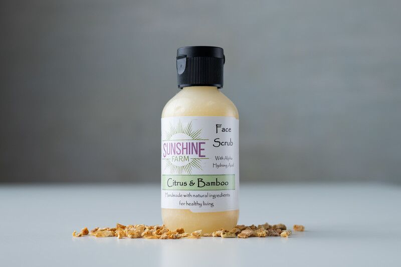 Step 2 Gently apply a generous amount of our Citrus and Bamboo Face Scrub and gently massage. Take care to stay away from the eye areas. This scrub has a very fine grit and natural alpha-hydroxy formula that will help to remove any dead skin cells laying on your skin’s surface. Be sure to let this formula sit on your skin for 2-4 minutes and rinse with warm water.