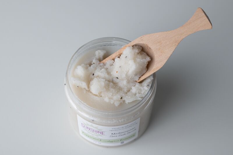 Contains: mediterranean sea salt, butyrospermum parkii (shea butter), prunus amygdalus dulcis (sweet almond) oil, cocos nucifera (coconut)oil, aloe barbadensis leaf extract (aloe butter), ricinus communis (castor) seed oil, macadamia ternifolia (macadamia) seed oil, persea gratissima (avocado) oil, maranta arundinacea root (arrowroot powder), proprietary essential oil and natural aroma compound blend, stearic acid, phenoxyethanoland caprylyl glycol (paraben formaldahyde free preservative).